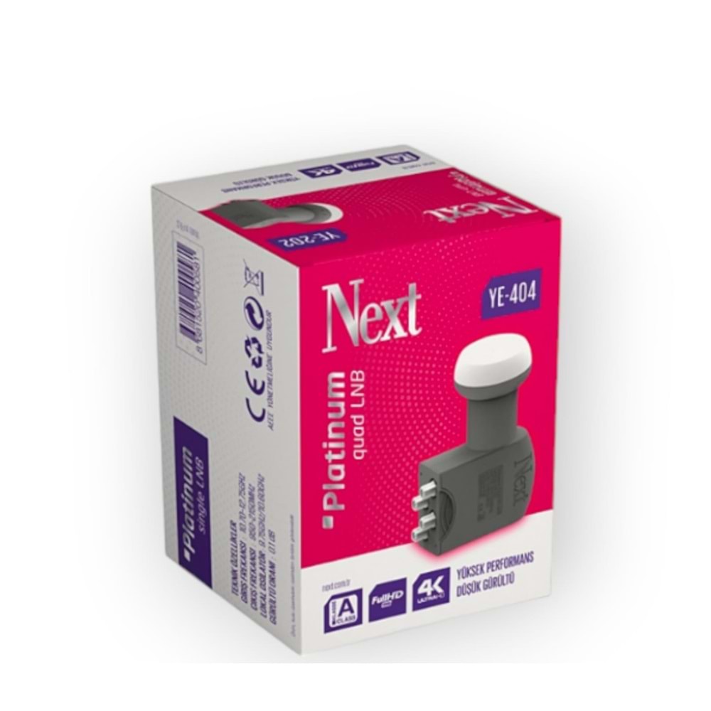 Next YE-404 Platinum Quad LNB, yüksek kaliteli sinyal alımı ve düşük gürültü oranıyla 4 farklı uydu alıcısına aynı anda yayın iletimi sağlar. Dayanıklı yapısı ve üstün performansıyla kesintisiz TV keyfi sunar.